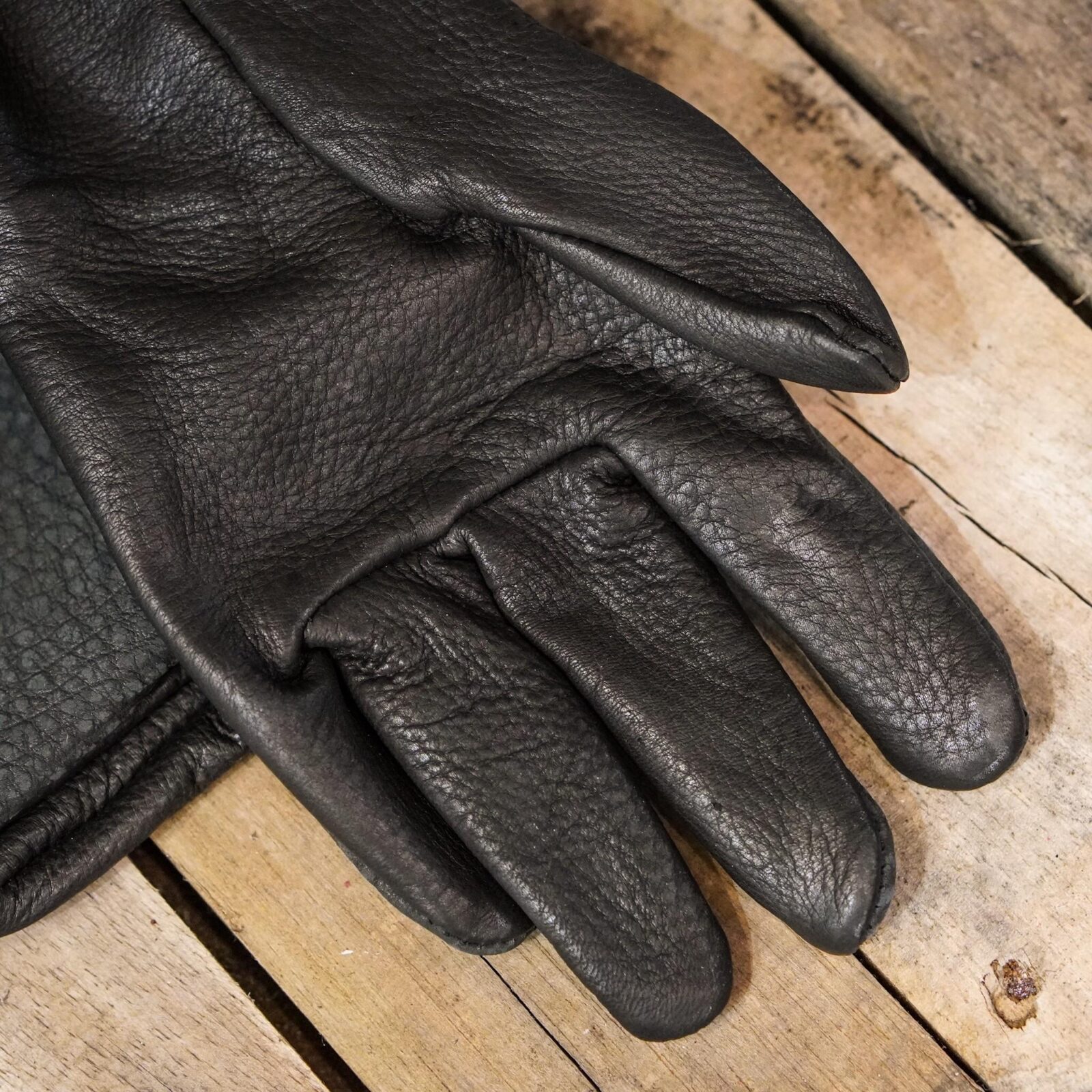 • These gloves are made in the USA from two different high quality hides. The top is a Distressed Black Bison paired with Ultra Soft Pebbled Deer on the palm. These gloves are short wrist and include a snap strap that can be used to snap the gloves together or to your helmet.